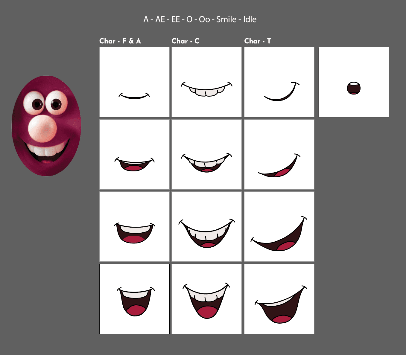A unique client request added an additional layer of craft — graphic mouth shapes mixed into the 3D characters. A full set of phoneme shapes — a, ae, ee, o, woo — alongside smile, surprise, and closed expressions were created and composited in Adobe After Effects, giving each character a distinctive, expressive voice to match their provided voiceover.