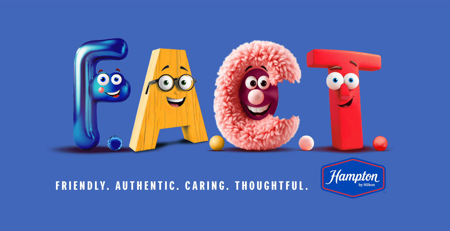 Hampton F.A.C.T. transforms four 2D branded characters into fully animated 3D personalities for Hampton's internal 2025 conference. Each character embodies a brand value — Friendly, Authentic, Caring, and Thoughtful — brought to life through character animation that interacted live with the conference host in real time.