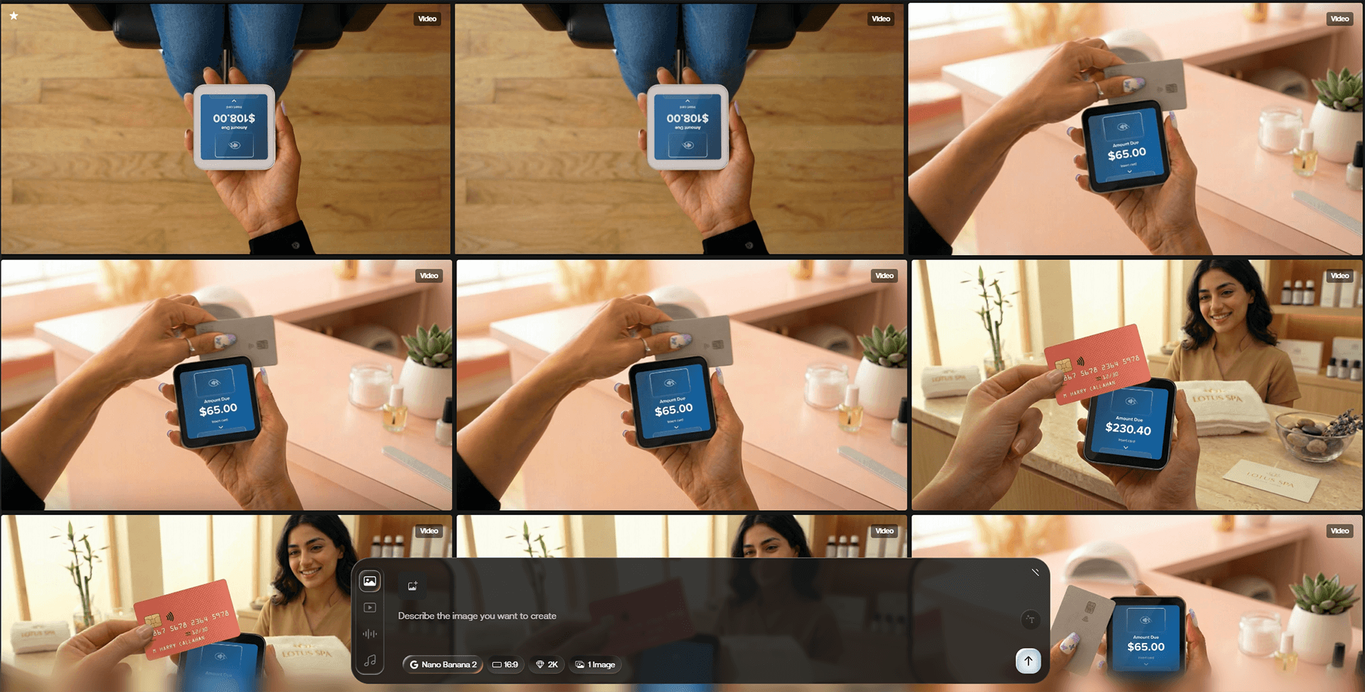 Claude and ChatGPT were used to generate director-level prompts — specifying shot composition, lighting, mood, and talent with the same intentionality applied to a live production brief. Those prompts fed into Google Flow AI to generate start frame images, which were then animated in Kling 3.0. Where AI couldn't deliver, the 3D file of PayPro Go was rendered separately and composited into each scene — giving full control over the device's scale, material, and finish.