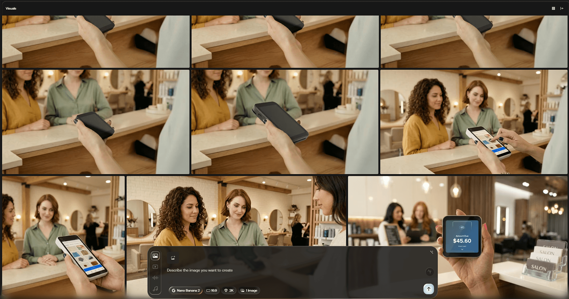 Each scene was directed around a specific industry Vagaro serves — hair salon, nail salon, spa, gym, and barbershop. The AI-generated talent was directed with equal specificity: a salon stylist in authentic workwear, a gym trainer on the floor, a spa owner in their environment, a barber at their station, a front desk person mid-transaction. Every appearance, costume, and setting was directed to feel like that person's real workplace — not a set dressed to look like one.