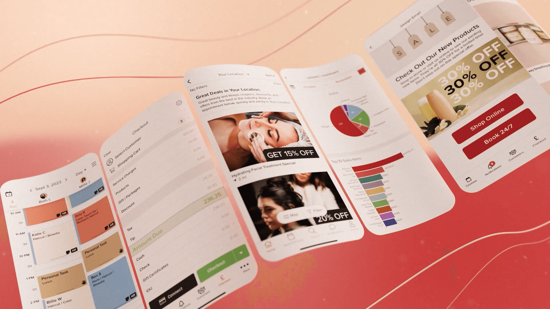 Abstract animation sequences were built using Vagaro's brand colors — red and a peachy cream — alongside flowing, wavy motion built around the brand's wave shape elements. The result was a feminine, fluid moment of visual delight that felt both branded and emotionally resonant.